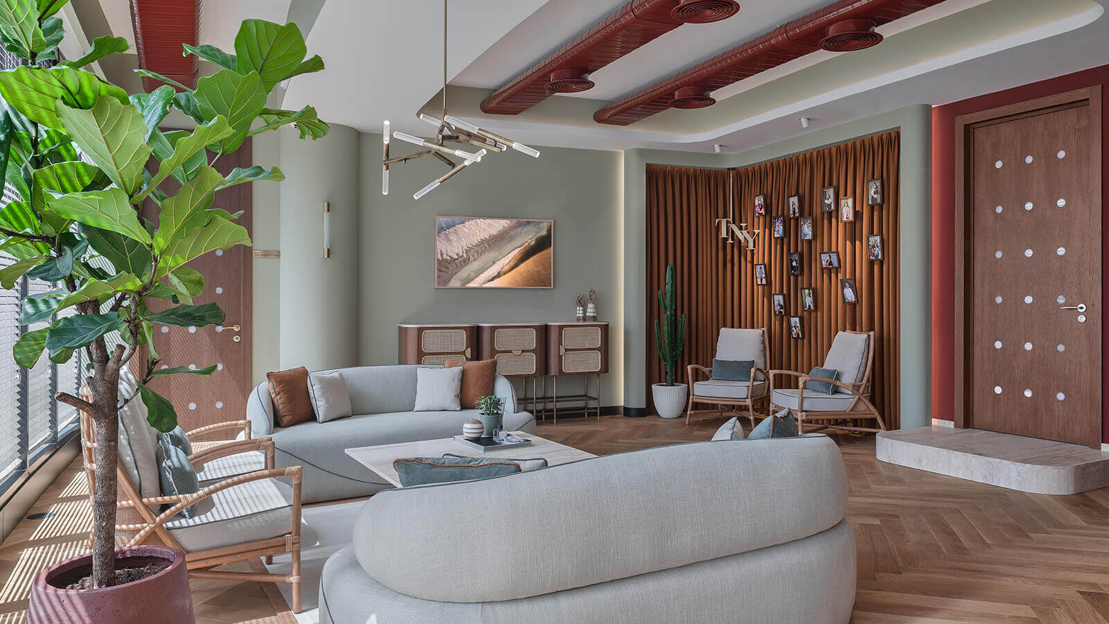 Doğal Malzeme Kullanımı: Ahşap, taş ve cam gibi malzemeler, mekana sıcaklık ve doğallık katarak sakin bir atmosfer oluşturur.