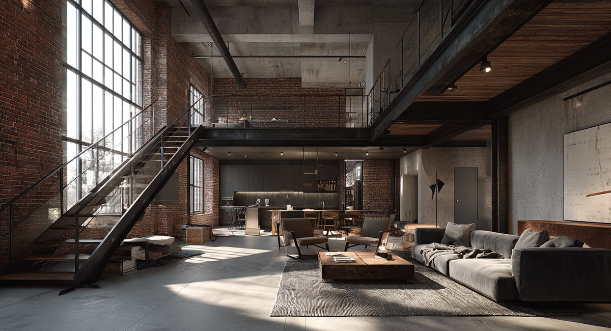 - Endüstriyel İç Mimariyi Vurgulayın: Açıkta bırakılmış tuğla duvar, metal merdiven, beton zemin gibi unsurları öne çıkarın.