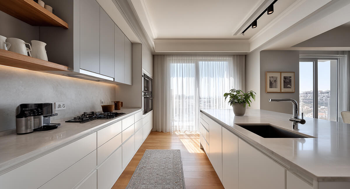 Yüksek kaliteli malzemeler: Kuvars tezgahlar, lake dolap kapakları ve dayanıklı zemin kaplamaları uzun ömürlü kullanım sağlar.