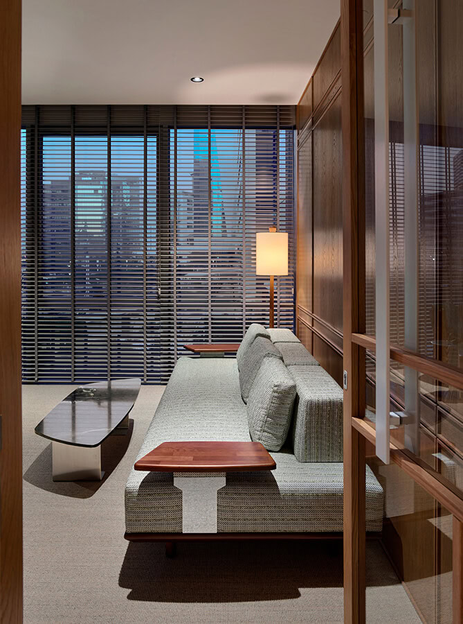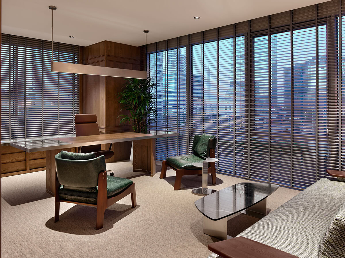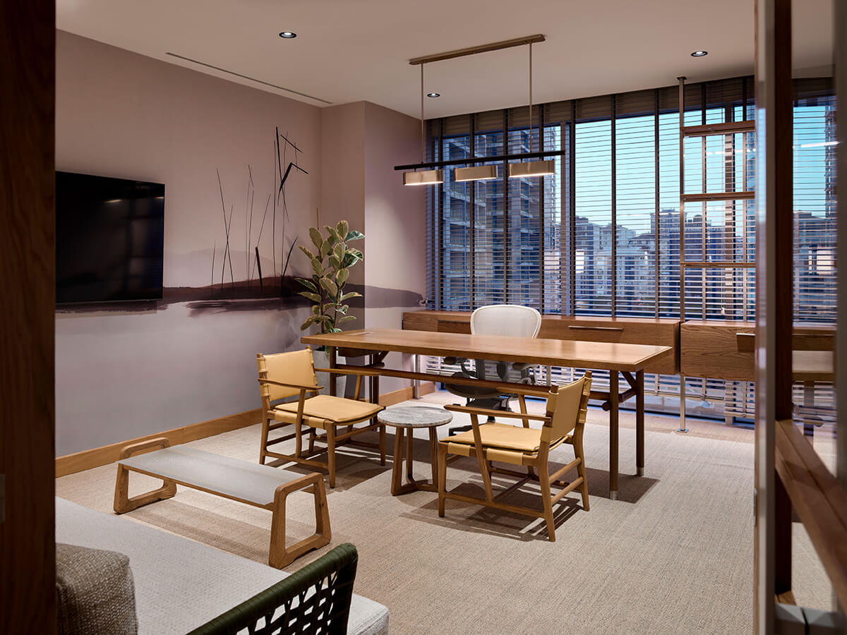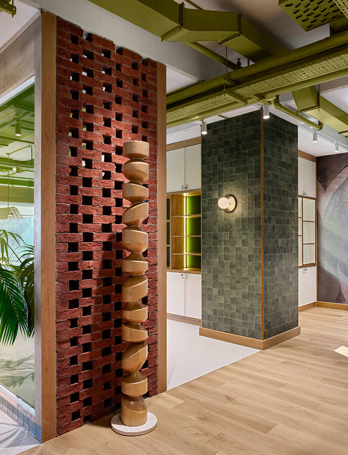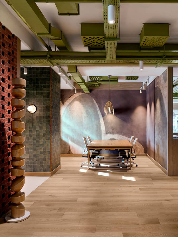 Projede, doğallık ve sıcaklık hissini artırmak amacıyla yumuşak dokulu kumaşlar, doğal ahşap yüzeyler ve sade renk paletleri tercih edildi. Bu malzemeler, sade ofis tasarımı prensipleriyle harmanlandı. İç mekân bitkilendirmesiyle duyusal denge desteklendi. Stratejik yerleştirilen yapay aydınlatmalarla modern ofis dekorasyonu zenginleştirildi.